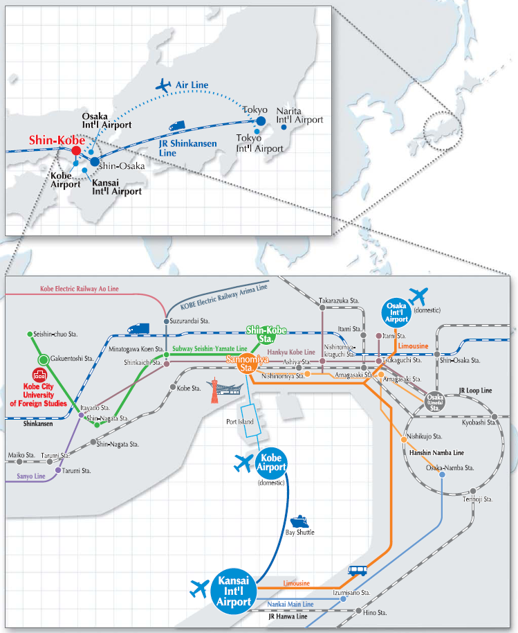 Kobe City University of Foreign Studies is located in the western suburbs of Kobe City, a 2-minute walk from Gakuentoshi (学園都市) station on the Seishin-Yamate Subway line (西神山手線), which is a 27-minute ride from Shin-Kobe (新神戸) for bullet train access. Kobe is also easily accessible from Osaka International Airport (Itami) and Kansai International Airport.